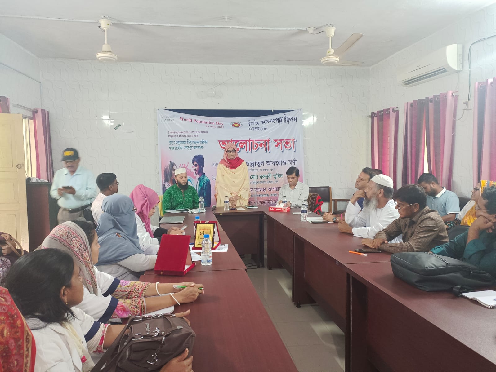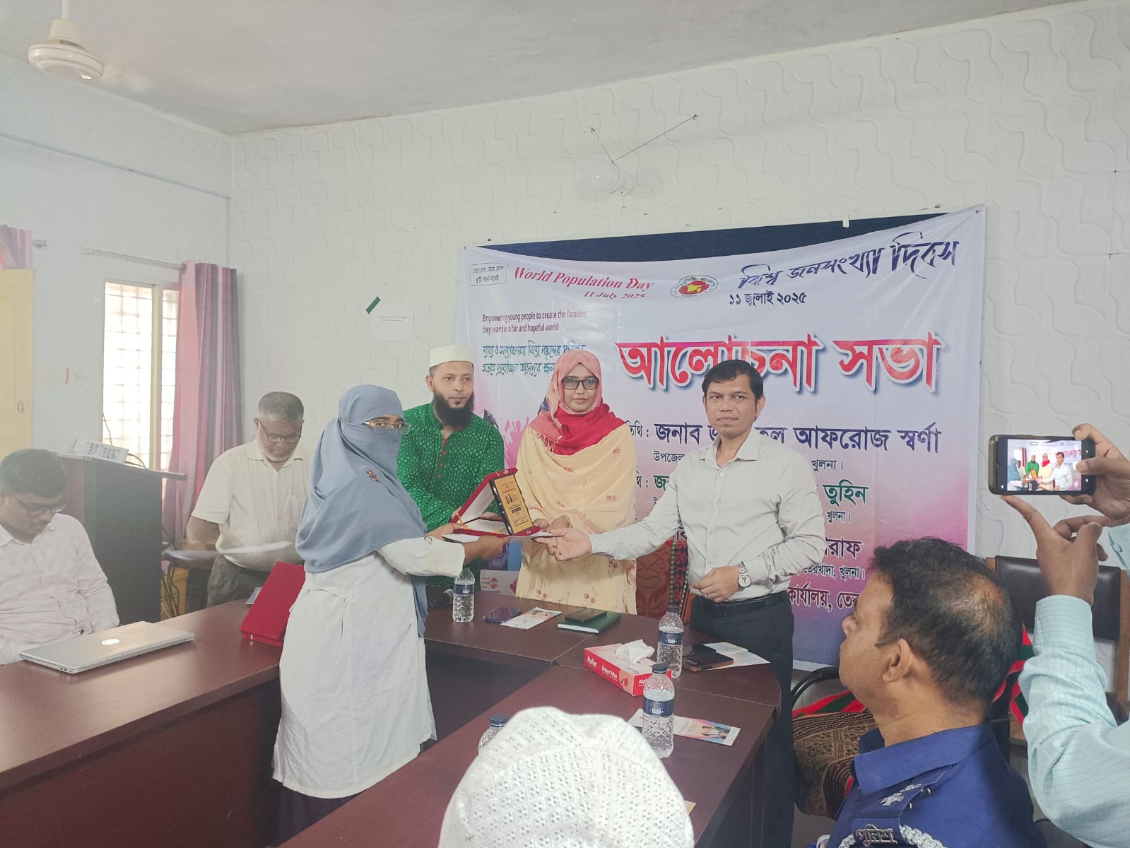 গত ১৪-০৭-২০২৫ খ্রিঃ তারিখে তেরখাদা উপজেলা স্বাস্থ্য কমপ্লেক্সের হলরুমে বিশ্ব জনসংখ্যা দিবস-২০২৫ উপলক্ষে একটি আলোচনা সভা ও পুরষ্কার বিতরণী অনুষ্ঠান অনুষ্ঠিত হয়। "ন্যায্য ও সম্ভাবনাময় বিশ্বে পছন্দের পরিবার গড়তে প্রয়োজন তারুণ্যের ক্ষমতায়ণ" এই প্রতিপাদ্যকে সামনে নিয়ে এবছরের বিশ্ব জনসংখ্যা দিবসের আলোচনায় প্রধান অতিথি হিসেবে উপস্থিত ছিলেন তেরখাদা উপজেলার উপজেলা নির্বাহী অফিসার জনাব জান্নাতুল আফরোজ স্বর্ণা। উপজেলা পরিবার পরিকল্পনা কর্মকর্তা(ভারপ্রাপ্ত) জনাব সৈয়দ তালহা আশরাফের সভাপতিত্বে অনুষ্ঠিত সভায় অন্যান্যদের মধ্যে উপস্থিত থেকে বক্তৃতা করেন উপজেলা স্বাস্থ্য ও পরিবার পরিকল্পনা কর্মকর্তা জনাব ডাঃ মোঃ নুরুন্নবী তুহিন, তেরখাদা প্রেসক্লাবের সভাপতি জনাব এস, এম, মফিজুল ইসলাম জুম্মান প্রমুখ। সভায় উপজেলার পরিবার পরিকল্পনা ও স্বাস্থ্য বিভাহের বিভিন্ন পর্যায়ের কর্মীগণ উপস্থিত ছিলেন। আলোচনা শেষে বিগত সময়ে পরিবার পরিকল্পনা এবং মা ও শিশুস্বাস্থ্য কার্যক্রমে গুরুত্বপূর্ণ ভুমিকা রাখার জন্য বিভিন্ন ক্যাটারিতে শ্রেষ্ঠত্ব অর্জনকারী ব্যক্তি ও প্রতিষ্ঠানের মধ্যে সনদপত্র ও ক্রেস্ট বিতরণ করা হয়।